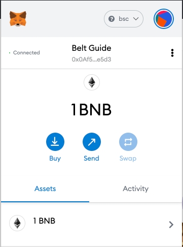 完成后,您的Metamask钱包应该看起来像以下这样。 在此时,可以看到目前持有1个BNB(您可以将ETH符号忽略为Metamask UI错误)。