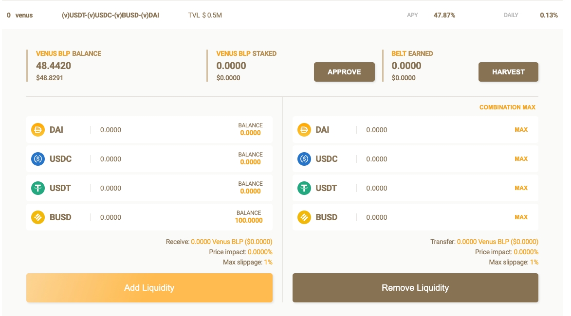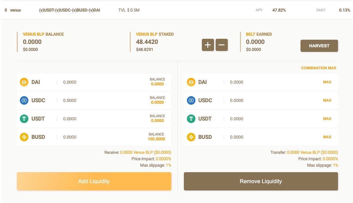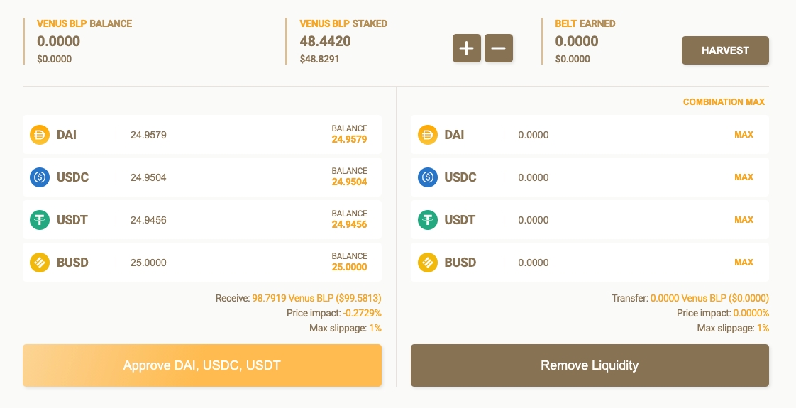 从这里开始,按“Approve LP Token(同意LP token)”将引导您确认合约(仅在初审时)。 确认后,您将在“Approve LP Token(同意LP token)”按钮的位置看到一个“Remove Liquidity删除流动性”按钮。 按此按钮并确认您的交易将从此池中删除您的流动性,您将收到显示的代币(DAI,USDC,USDT,BUSD)。 这些代币将显示在您的钱包中。