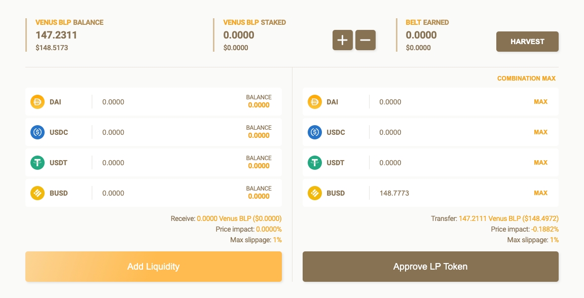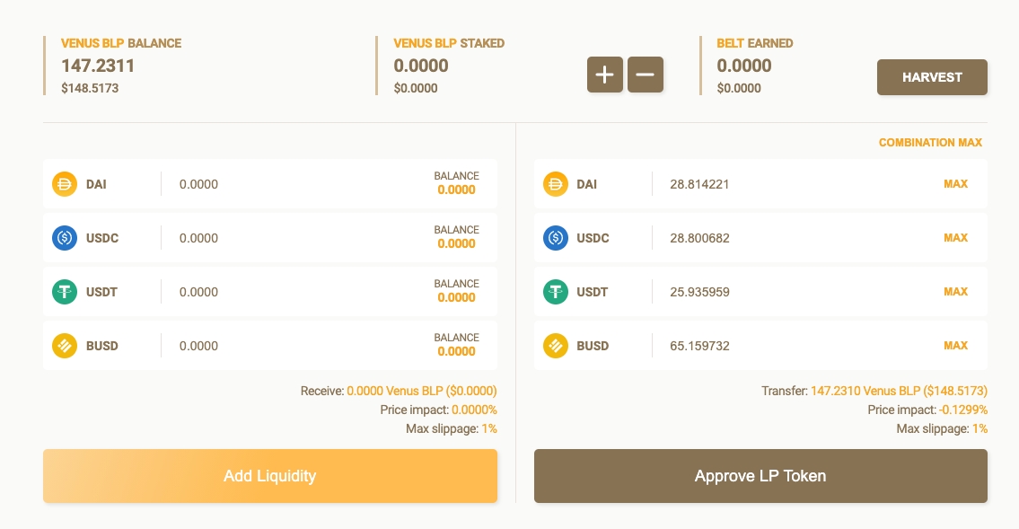 完成所有兑换后,“BELT LP staking”部分应显示您具有所有相关token。 在设置了您要投入的每个token的数量之后(按“Balance”会自动将其设置为您拥有的最大token),然后同意尚未同意的所有token。