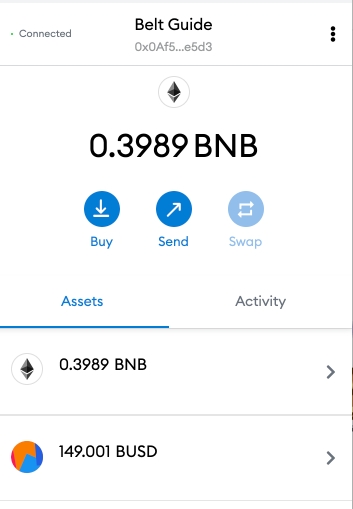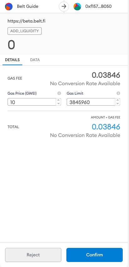 在继续之前,请确保使用belt时钱包中有足够的BNB来支付相关的交易费用。