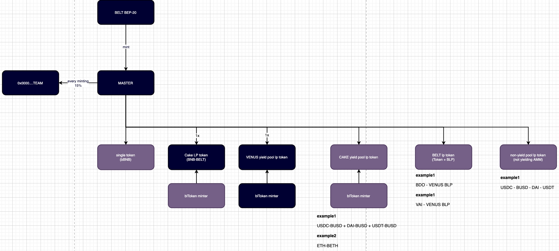 在Belt.fi中,所有tokens或LP tokens都可以被池化。 池的组成由通过AMM支持滴交易费和低滑点的具有相同来源或相同价值的tokens和 LPs。 我们协议中最好的组合将产生更多的收益,并为Belt.fi集合流动性提供者带来更多的激励。 其中一些池可能包含以下几种: